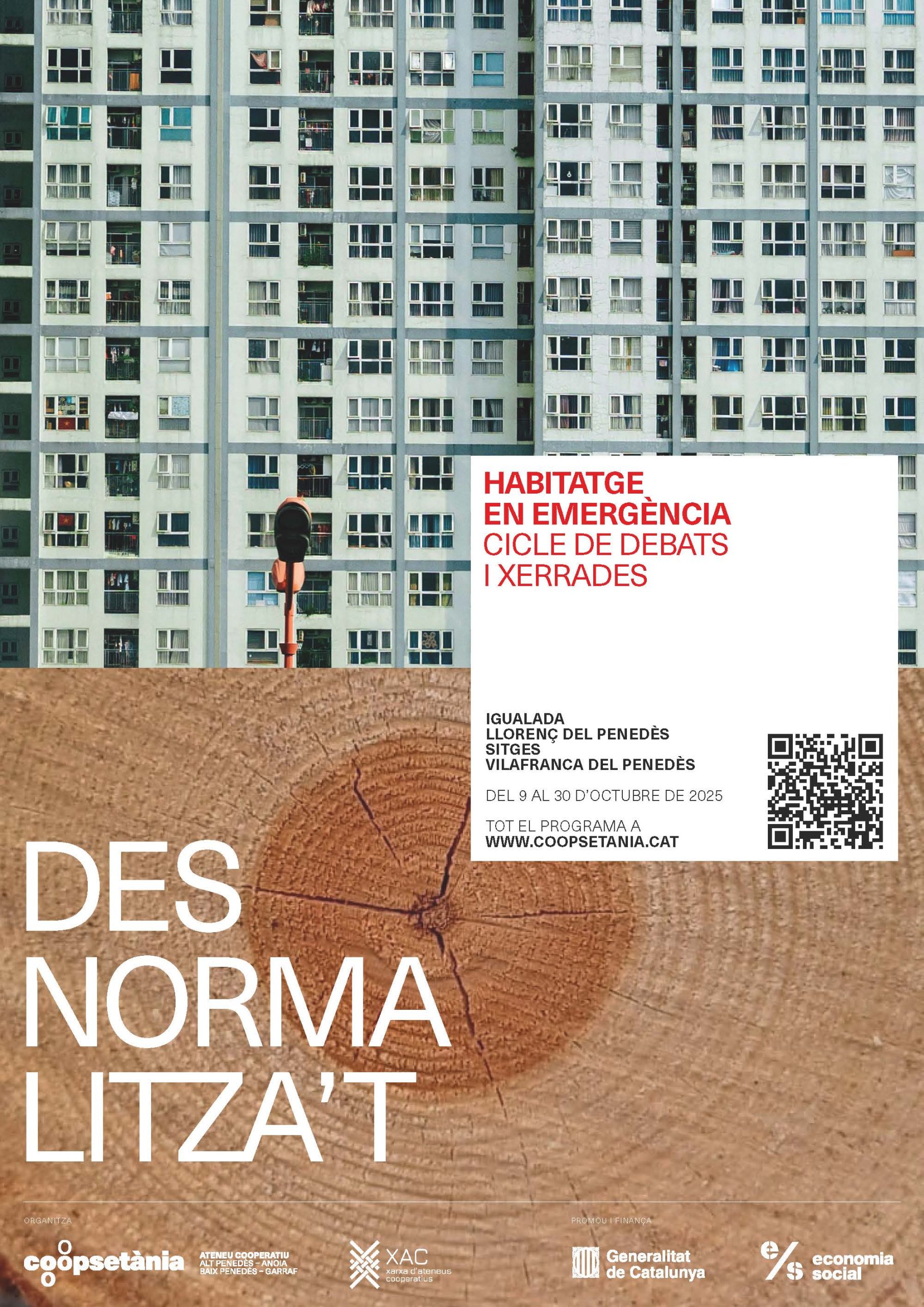 La 5a edició del Desnormalitza’t tindrà lloc del 9 al 30 d’octubre i, en aquesta ocasió, es dedicarà a l’habitatge, concretament, a l’habitatge cooperatiu. A partir d’un joc polisèmic amb el terme “emergència”, el cicle pretén generar pensament crític al voltant d’una temàtica d’actualitat, així com mostrar respostes transformadores des del cooperativisme i l’economia social i solidària. Enguany, Coopsetània posa el focus en la vulneració del dret a l’habitatge i en la inestabilitat residencial existents arreu de Catalunya i a la vegueria Penedès. I, en contraposició, mostra les respostes col·lectives en matèria d’habitatge que sorgeixen.